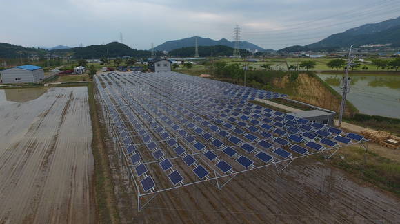 한국남동발전은 경남 고성군 하이면 덕호리 일대 약 2000평 부지에 100kW급 태양광설비를 설치하고 지난 13일 모내기를 마친 후 15일 전력생산 및 판매를 실시했다.
