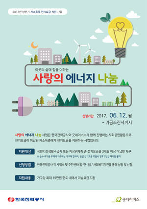 '사랑의 에너지 나눔' 사업은 전기요금 납부가 어려운 취약 계층의 정상적 전기사용을 위해 전기요금을 지원하는 한전의 대표적인 사회공헌 활동으로 2003년부터 15년째 이어오고 있으며, 현재까지 전국의 2만2000여 가구에 약 29억원의 전기요금을 지원했다.
