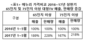 이 같은 추세는 국내도 마찬가지다. 최근 가격비교사이트 에누리 자료를 보면 올해 상반기(1~5월) 55인치 이상 대형 TV 매출은 58%로 절반 이상의 점유율을 차지했다.