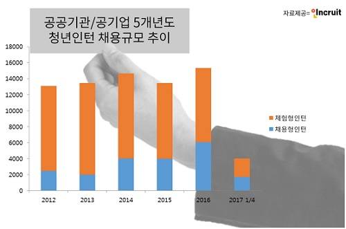 취업포털 인크루트(대표 이광석)가 공공기관 경영정보 공개시스템 알리오에 공시된 355개의 공공기관 및 공기업의 5개 년도 청년인턴 채용 규모를 조사한 결과, 올해 1분기 채용한 청년인턴의 비중은 채용형 인턴이 43%, 체험형 인턴이 57%의 비중을 차지했다. 채용형 인턴의 채용이 19%에 그쳤던 2012년에 비해 24%가량 증가한 것.