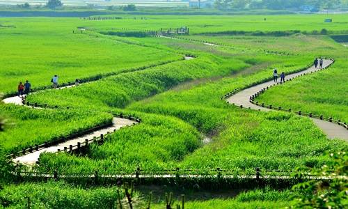 순천만하면 황금빛 갈대를 떠올리기 십상이지만 이리저리 굽이치는 여름날의 갈대숲은 초록빛으로 물들어 있고,초록빛 천지 속으로 천천히 걸어 내려가노라면 온몸에 푸른 갈대가 가득 들이찬다. 바닥을 기어 다니다 팔짝팔짝 뛰는 짱뚱어와 재빠르게 옆걸음을 치는 농게, 방게, 칠게 등과 용산전망대에 바라보는 아름다운 일몰,환상적인 S라인으로 굽이도는 물줄기와 사이사이 커다란 동그라미를 그리며 자리잡은 갈대군락을 만나게 된다.