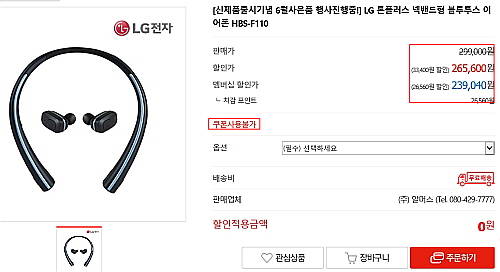 27일 올레샵에 선보인 상품 중 지난달 출시된 LG전자의 '톤플러스 프리 블루투스 이어셋(HBS-F110)'은 판매가 29만9000원에 판매되고 있다. 여기에 올레샵 할인과 KT 멤버십 차감을 통한 할인을 적용하면 총 23만9040원에 살 수 있다고 소개돼 있다.