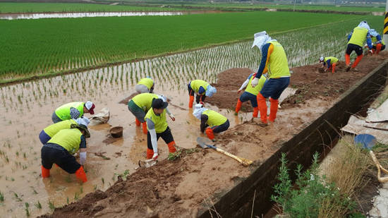 27일 오전 복구지원 활동에 나선 농협 직원 50여명은 폭우로 논둑이 유실되면서 논으로 유실된 토사 제거작업과 제방 복구작업을 펼쳤다.