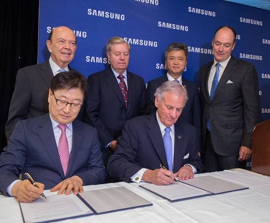 삼성전자는 28일(현지시간) 미국 워싱턴DC에 있는 윌라드 호텔에서 뉴베리 카운티에 가전 공장을 설립한다는 내용의 투자 의향서(LOI)를 체결했다고 밝혔다. 이 자리에는 윤부근 삼성전자 CE부문 대표이사와 헨리 맥마스터(Henry McMaster) 사우스캐롤라이나 주지사가 참석했다.