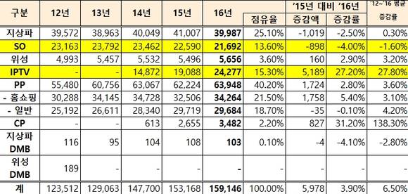 공표 내용에 따르면, 전체 방송사업 매출은 전년(2015년) 대비 3.9%(5978억원) 증가한 15조9146억원이다. 이 중 위성방송사업자, IPTV, 방송채널사용사업자(PP) 및 IPTV 콘텐츠사업자(CP)의 방송매출은 늘었지만 지상파, SO, 지상파이동멀티미디어방송사업자(DMB)의 방송매출은 감소했다.