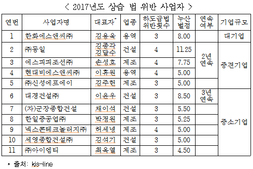 [프라임경제] 2017년도 하도급 거래 상습 법 위반 사업자(이하 상습 법 위반 사업자) 11개 사를 확정해 지난 6월29일 공표했다.