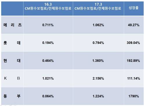 이는 비슷한 시기에 CM채널을 오픈한 △롯데손해보험(2015년 12월) △현대해상(2016년 1월) △KB손해보험(2016년 1월) △동부화재(2016년 3월)의 성장률 중 최하위 수치다.