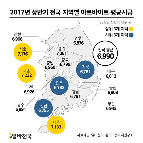 주요 지역별 시급은 △서울 7176원 △제주 7133원 △인천 6966원 △충남 6960원 △부산 6943원 △대전 6926원 등의 순으로 많았다.