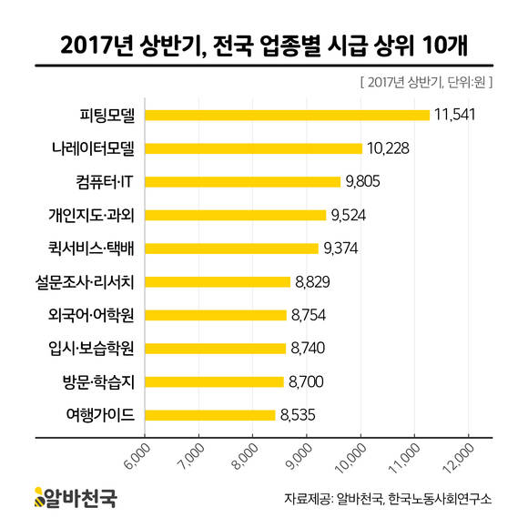 반면 평균 시급이 가장 높은 업종은 피팅모델로 시급이 11541원이었다. 이는 시급 상위 10개 업종의 평균 시급인 9403원보다 2138원 많은 금액이다.