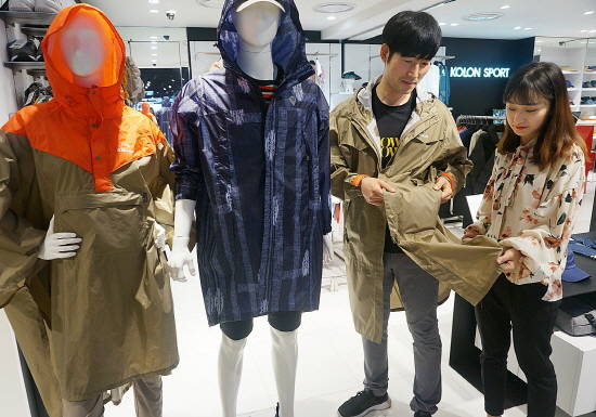 이외에도 대구점 7층에 위치한 유명 아웃도어 브랜드 코오롱스포츠에서는 차별화된 디자인의 '웨더코트'를 출시했다. '웨더코트 는윈드브레이커와 레인코트 기능을 모두 갖춘 멀티플레이 제품으로 바람이 부는 날에는 방풍재킷 기능을, 비가 오는 날에는 레인코트로 활용할 수 있다.