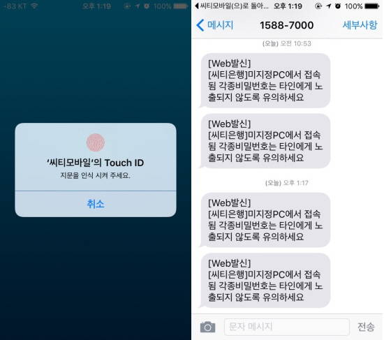 씨티은행을 이용하는 A씨는 6일 오전 8시10분께 씨티모바일의 지문인식 접속 과정에서 '미지정 PC에서 접속됨. 각종 비밀번호는 타인에게 노출되지 않도록 유의하세요'라는 안내 문자를 받았다.