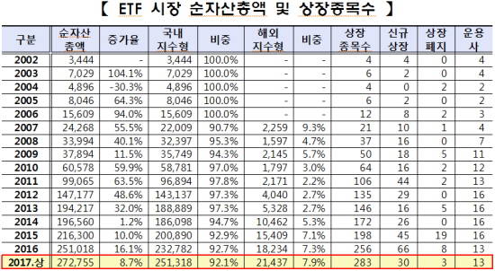 한국거래소에 따르면 올해 상반기 순자산총액은 27조원으로 작년 말 25조원 대비 8.7% 올랐고, 전체 상장종목수는 283종목으로 작년 말 256종목 대비 27종목 증가했다.