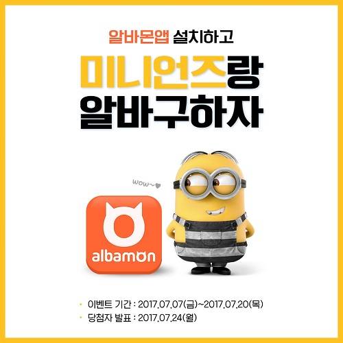 [프라임경제] 취업포털 잡코리아가 운영하는 아르바이트포털 알바몬(대표 윤병준)이 영화 '슈퍼배드3'과 함께 '미니언즈랑 알바 구하자' 이벤트를 오는 20일까지 진행한다고 10일 밝혔다.