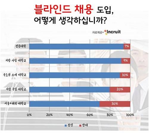 취업포털 인크루트(대표 이광석)가 지난 6일부터 7일까지 인크루트 회원 404명을 대상으로 진행한 '블라인드 채용에 관한 의견 조사' 설문 결과에 따르면, 서울시 및 해외 소재 대학교 출신자 10명 중 3명은 블라인드 채용의 취지에 '공감하지 못하는 것'으로 나타났다.