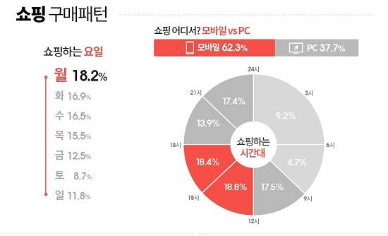 먼저 인터파크 쇼핑 자체 DB를 분석한 결과 일주일 중 월요일에 쇼핑한 사람이 18.2%로 가장 많았다. 시간대별로는 점심 직후 마음 편히 쇼핑할 수 있는 오후 12시에서 3시 사이의 비중이 18.8%로 가장 높았다.