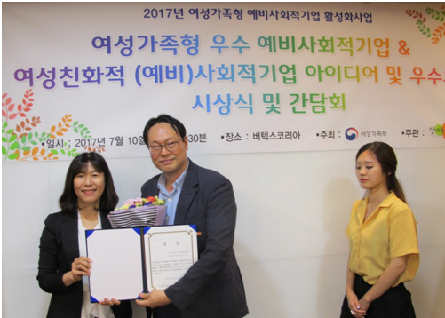 '여성 친화적 사회적기업 아이디어 및 우수모델 공모전'은 여성가족부가 주최하고 한국 마이크로크레디트 신나는조합에서 주관한 행사다.