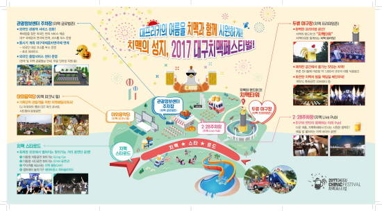 'Be Together! Be Happy!, 가자~ 치맥의 성지 대구로!'라는 주제로 2017 대구치맥페스티벌이 19일부터 23일까지 닷새간 두류공원 일대와 평화시장 닭똥집골목, 서부시장 오미가미거리 일원에서 열린다.