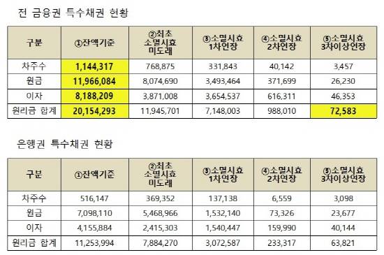 특수채권의 소멸시효를 연장시키는 행태는 이미 금융권 전반에 깔린 상황이다. 정무위 소속 제윤경 의원(민주당)이 금융감독원을 통해 각사로부터 제출받은 '금융권 특수채권 현황' 자료를 보면, 3월 말 기준 전체 금융사(증권업, 대부업 제외)의 5년 이상 연체된 채권 규모는 20조1542억원(원금 11조9660억원, 이자 8조1882억원)으로 집계됐다.
