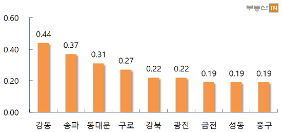 전세시장의 경우 서울은 △강동(0.44%) △송파(0.37%) △동대문(0.31%) △구로(0.27%) △강북(0.22%) △광진(0.22%) △금천(0.19%) △성동(0.19%) 순으로 전셋값 상승이 보였다.