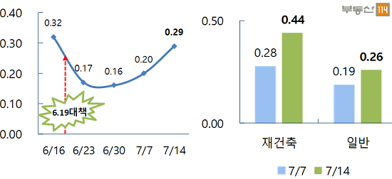 부동산114에 따르면 6·19대책 발표 전 0.32%(6월 2주차)였던 서울 아파트값 상승률은 대책 발표 뒤 2주 연속 0.17%, 0.16%을 기록하다 지난주 0.20%로 올랐다. 이번 주에는 0.009가 올라 0.29%를 기록했다.