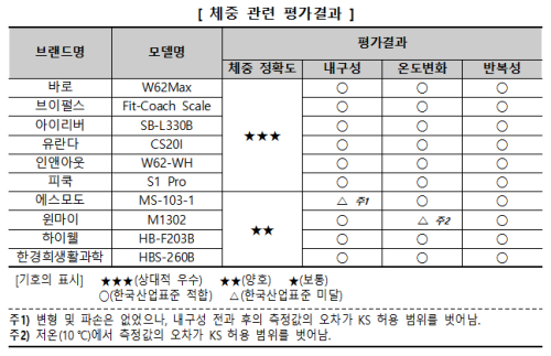 그 결과 체중의 정확도는 제품별 차이를 보였다. 또 체지방률의 정확도는 우수한 제품은 없고 양호한 수준인 것으로 나타났다. 일부 제품의 경우 내구성 등에서 한국산업표준 허용 범위에 미달했으며 상대적으로 품질이 떨어졌다.