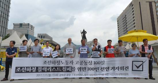 현대중공업 울산조선소 앞에서는 사내하청지회 소속 노동자 2명이 노동조합에 가입한 조선업체 하청노동자에 대한 블랙리스트 작성과 대량해고를 중단할 것을 요구하며 97일째 고공농성을 이어가고 있다.
