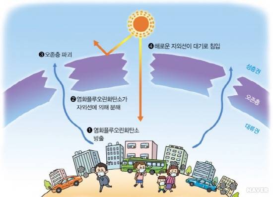 땅에서 10km 정도 위의 하늘에 있는 오존층은 이런 자외선을 흡수해주는 역할을 해요. 그런데 지구의 하늘을 지키는 오존층이 자꾸 얇아지고 있어요. 환경오염 때문에 그래요. 오존층이 줄어들면서 땅 쪽으로 자꾸 내려오는데요, 이러면 오존층이 원래 기능을 제대로 못 해요.