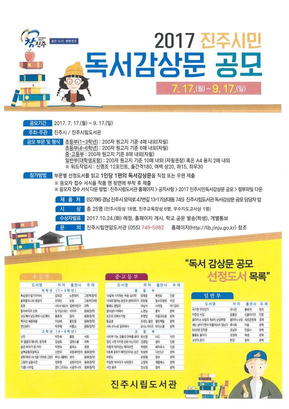 공모기간은 9월17일까지며, 진주시민이면 누구나 응모가능하다. 응모는 부문별 선정도서 중 한 권을 읽고 200자 원고지 기준으로 초등부 4~6매, 중·고등부 8매, 대학 및 일반부 10매 안팎으로 작성해 접수서식을 붙여 제출하면 된다. 제출은 시립도서관 방문 또는 우편으로 가능하다.