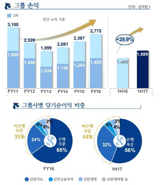 신한캐피탈의 상반기 순이익은 461억원, 2분기 순이익은 276억원으로 전년 동기 대비 및 전분기 대비 각각 127.3%, 48.3% 늘어났다. 신한BNP파리바자산운용의 상반기 순이익은 65억원(지분율 감안 후)이며, 신한저축은행은 82억원의 순이익을 기록했다.