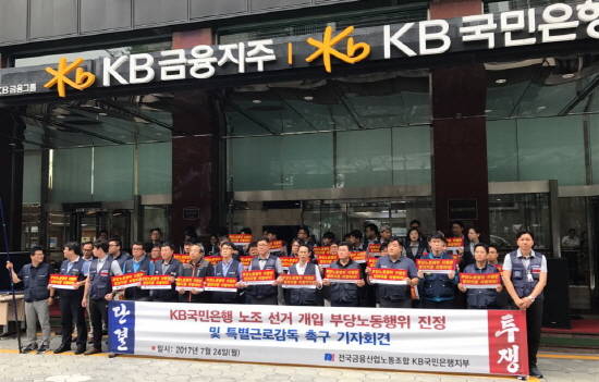 금융노조 국민은행 지부는 24일 오전 10시 여의도 국민은행 본점 앞에서 기자회견을 열고, 지난해 10월부터 두 번에 걸쳐 치러진 노조 선거에서 사측이 현 노조 위원장의 당선을 막기 위해 조직적인 부당노동행위를 했다고 주장했다.
