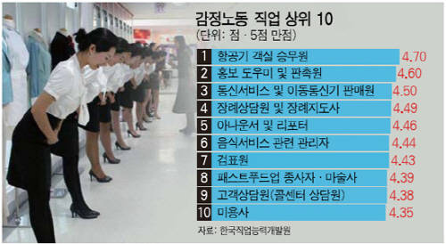 한국직업능력개발원이 판매 서비스직, 경영 재무직, 사회 서비스직 등 203개 직업 종사자 5667명을 분석해 감정노동 정도를 측정한 결과 △항공기 객실 승문원 △홍보 도우미 및 판촉원 △통신서비스 및 이동통신기 판매원 △장례상담원 및 장례지도사 △아나운서 리포터 순으로 감정노동 강도가 심했습니다.