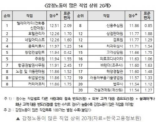 이런 가운데 한국고용정보원은 국내 주요 730종 직업별로 1년 이상 재직자 35명씩 2만5550명을 표본 조사했습니다. 다른 사람과의 접촉빈도(5점), 외부 고객 대응 중요도(5점), 불쾌하거나 화난 고객 대응 빈도(5점)를 합산해 직업별 순위를 매겼는데요.