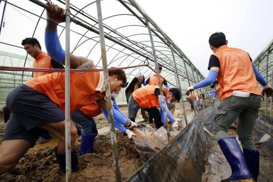이에 충청지역에 근무하는 한화그룹의 임직원들로 구성된 '한화사회봉사단' 100여명은 이날 하루 종일 농가를 찾아 피해를 입은 농작물 제거와 비닐하우스 철거작업 등을 도우며 구슬땀을 흘렸다.