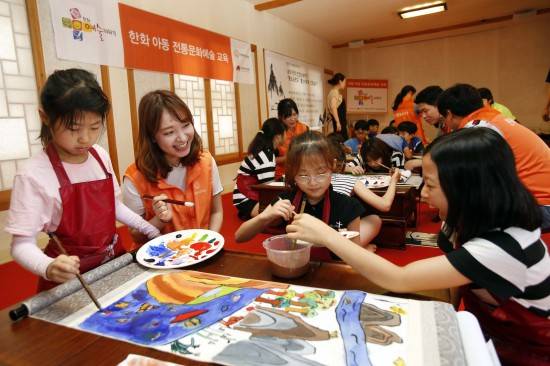 한화는 예술더하기 프로그램을 통해 전국 21개 초등학교 및 복지기관 소속 400여명의 어린이들에게 매주 한 번씩 사물놀이·전통무용·서예·민화 등 전통문화 예술교육을 실시하고 있다.