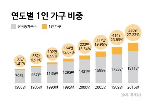 통계청 자료를 보면 우리나라 1인 가구 수는 2016년 10월 기준 527만9000가구로 2015년 대비 16만9000가구 증가한 수치를 보였습니다. 전체 가구에서 1인 가구 비중은 27.8%로 1990년 1인 가구 수 102만1000가구에서 25년 만에 5배 이상 늘어난 수치죠.