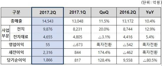 또 전자재료 사업부문은 반도체 시장 호황에 힘입어 수요 확대로 매출과 수익성이 전분기 대비 증가했으나, 편광필름과 태양광 페이스트는 전방산업 약세로 소폭 감소했다.