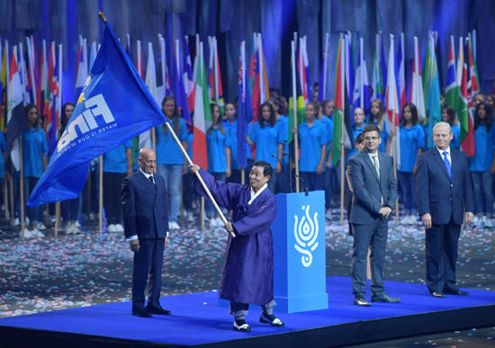 윤장현 광주광역시장은 30일(현지시간) 헝가리 부다페스트에서 열린 제17회 세계수영선수권대회 폐막식에 참석해 차기 대회 개최도시 대표로 대회기를 인수했다.