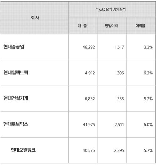 아울러 현대로보틱스는 LCD 부문 글로벌 투자 확대에 따른 클린용 로봇 판매량 증가와 현대케미칼 가동으로 매출 4조1975억원, 영업이익 2511억원을 기록했다. 특히 주요 자회사인 현대오일뱅크가 매출 4조576억원, 영업이익 2295억원으로 대부분의 실적을 견인했다.