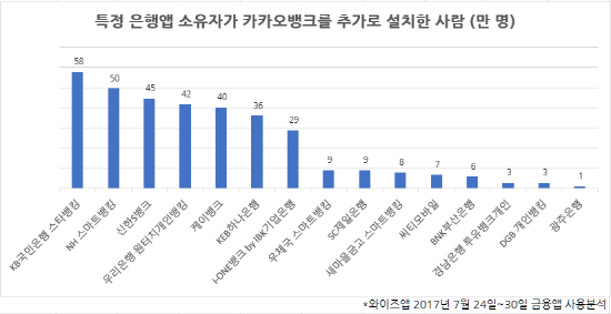 스타뱅킹 설치자 중 카카오뱅크를 추가로 설치한 사람은 총 58만명으로 가장 많았다. 이어 'NH 스마트 뱅킹'를 동시에 보유한 사람은 50만명이었으며, 신한S뱅크 고객은 45만명으로 집계됐다.