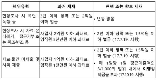 개정법에 따라 공정위 조사과정에서 폭언이나 폭행을 저지를 경우 3년 이하 징역 또는 2억원 이하 벌금에 처해지며 자료접근을 막거나 이를 은닉·폐기 혹은 위·변조한 사업자 및 임직원에 대해서도 2년 이하 징역 또는 1억5000만원 이하 벌금이 부과된다.