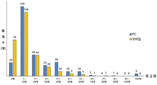 광고를 게재하지 않는 페이지는 78개(26%)였으며 PC와 마찬가지로 1개에서 10개의 광고를 게재한 매체가 138개(46%)로 가장 많았다.