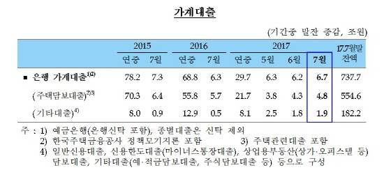 한국은행이 9일 발표한 '2017년 7월 중 금융시장 동향'에 따르면 정책모기지론을 포함한 7월 말 은행 가계대출 잔액은 전월대비 6조7000억원 늘어난 737조7000억원이다. 이는 8조8000억원 증가한 지난해 11월 이후 최대 증가 폭이다.