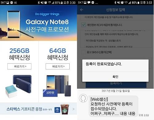 기종을 선택한 후 예약자 성명, 예약통신사, 전화번호 등 개인정보를 입력하고 사전예약을 신청하면 '등록이 완료되었습니다'라는 문구가 뜬다. 이와 함께 '요청하신 사전예약 등록이 접수되었습니다. 어쩌구…저쩌구… 내용 내용' 이라는 문자메시지도 전송된다.