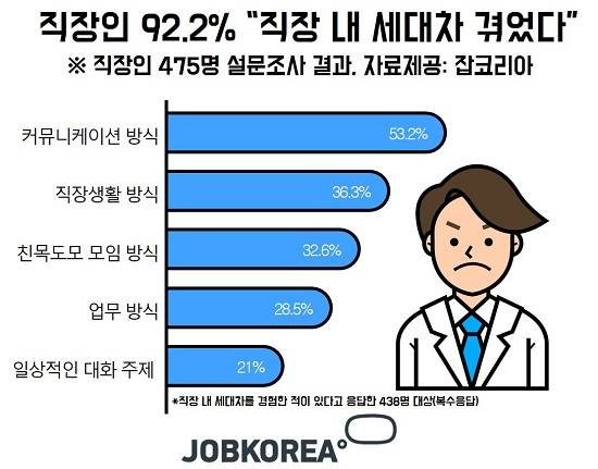 취업포털 잡코리아(대표 윤병준)가 직장인 475명을 대상으로 '직장 내 세대차이'에 대해 설문조사를 실시한 결과 92.2%가 '직장 내 세대차이를 경험한 적이 있다'고 응답했다.