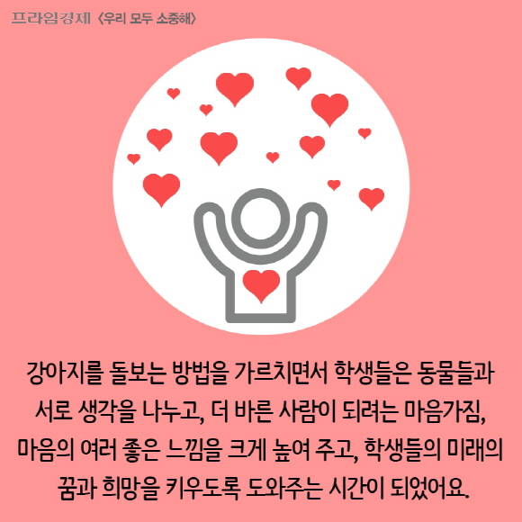 [프라임경제] '우리 모두 소중해' 캠페인의 재능기부 편집위원으로 참여하는 청소년 학생들은 발달장애인들의 감수를 거친 [우리모두뉴스] 기사를 [카드뉴스]로도 제작합니다. 이번에는 서울국제학교 10학년 노선희 학생이 "호산나대학에서 강아지를 돌보는 방법을 배워보고 왔어요" 기사를 카드뉴스로 제작했습니다.