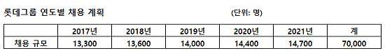 롯데는 향후 지속적인 투자와 함께 점진적으로 채용인원을 늘려 2017년부터 향후 5개년간 약 7만명을 채용할 예정이다. 7만명 채용 계획 중 유통 부문은 전체 61%인 4만2600명으로 가장 높고, 식품 20%, 호텔·서비스 12%, 케미칼/금융 7% 순이다.