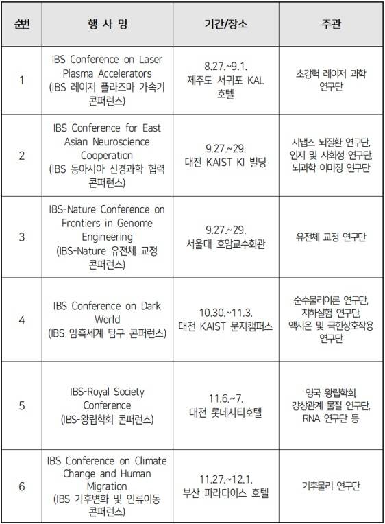 올해는 27일부터 5일간 제주도 KAL 호텔에서 열리는 'IBS 레이저 플라즈마 가속기 콘퍼런스(IBS Conference on Laser Plasma Accelerators)'를 시작으로 다음 달 중국 신경과학연구소(ION, Institute of Neuroscience)와 공동으로 주최하는 'IBS 동아시아 신경과학 협력을 위한 콘퍼런스(IBS Conference for East Asian Neuroscience Cooperation)', 학술지 네이처와 공동으로 주관하는 'IBS-Nature 유전체 교정 콘퍼런스(IBS-Nature Conference on Frontiers in Genome Engineering)' 등이 준비돼 있다.