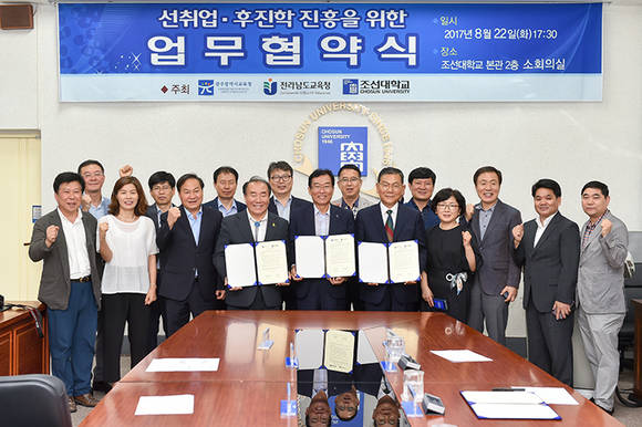 협약내용은 '선취업·후진학 생태계 조성을 위한 진로진학 정보교류 협력, 특성화고 재학생을 위한 선취업·후진학 맞춤형 교육 프로그램 개발, 특성화고 졸업자에 대한 조선대학교 가족회사 선취업 지원, 기타 양 기관의 우호증진을 위한 상호협력' 등이다.