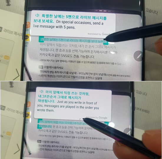 이 중 S펜을 활용한 번역 기능은 실생활에서 유용하게 사용될 것으로 보인다. 전작인 갤럭시노트7에서는 단어 번역 정도만 지원했다면, 이제는 문장을 통째로 해석해준다. 현재 39개 언어를 인식할 수 있으며, 번역되는 언어는 총 71개에 달한다는 게 회사 관계자 설명이다.