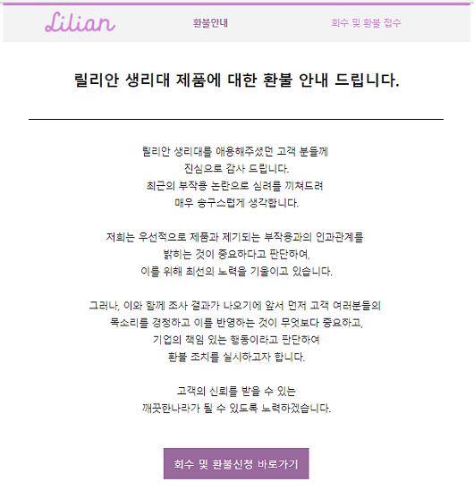 깨끗한나라(004540)는 홈페이지와 고객센터를 통해 "릴리안 생리대를 애용해주셨던 고객분들께 진심으로 감사드린다"며 "인과관계에 대한 조사 결과가 나오기 전이지만 고객 여러분들의 목소리를 경청하고 이를 반영하는 것이 무엇보다 중요하고 기업의 책임 있는 행동이라고 판단해 28일부터 환불 조치를 시행한다"고 밝혔다.